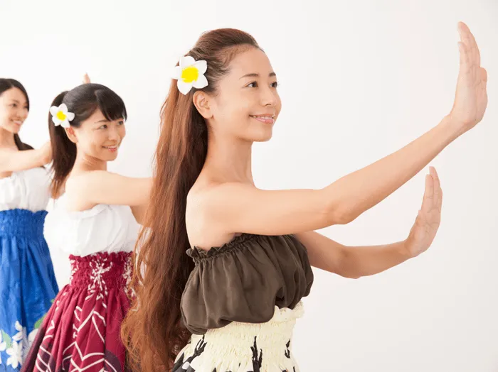 フラとは、ハワイ語で「踊り」のこと。手や腰の動きひとつひとつに意味があり、花や雨、波などを踊りで表現しながら、自然と自分がひとつになっていきます。